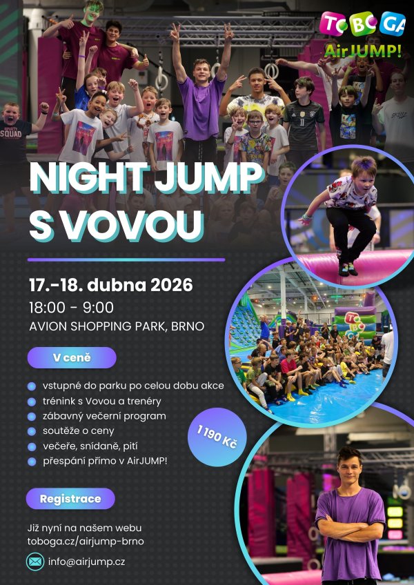 NIGHT JUMP s Vovou je zpět a znovu přináší jedinečnou přespávačku v jump parku, kde zábava nekončí ani po zavření arény.