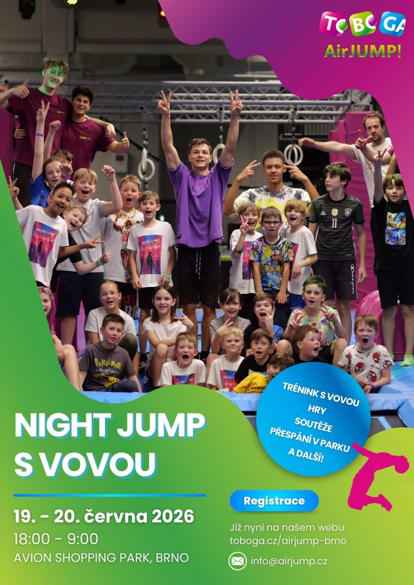 NIGHT JUMP s Vovou je zpět a znovu přináší jedinečnou přespávačku v jump parku, kde zábava nekončí ani po zavření arény.