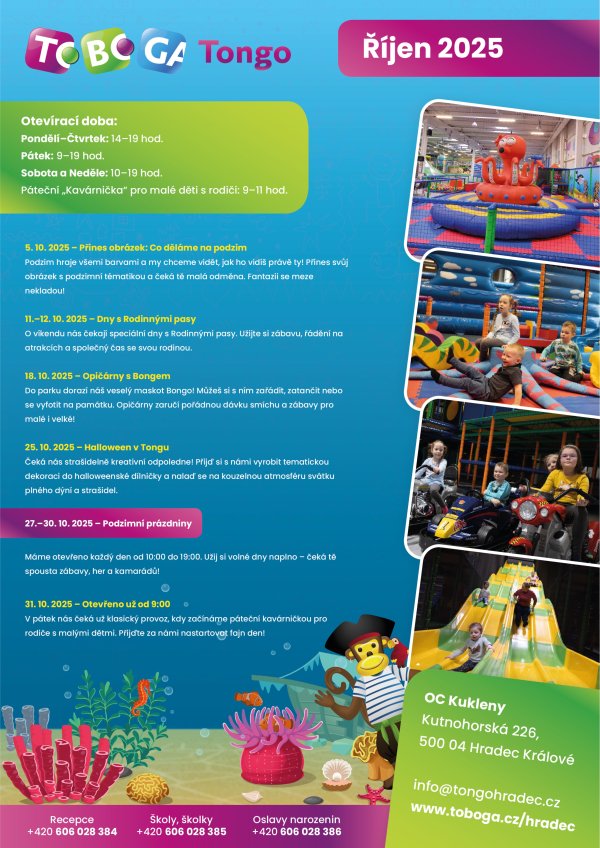 Na začátku měsíce si děti přinesou vlastní podzimní obrázek a za odměnu rozveselí náš park. V polovině října si užijeme speciální dny s Rodinnými pasy, poté dorazí náš veselý opičák Bongo a rozpoutá pořádné opičárny plné smíchu. Čeká nás také strašidelně laděný Halloween s dílničkou, kde si každý vyrobí originální dekoraci.