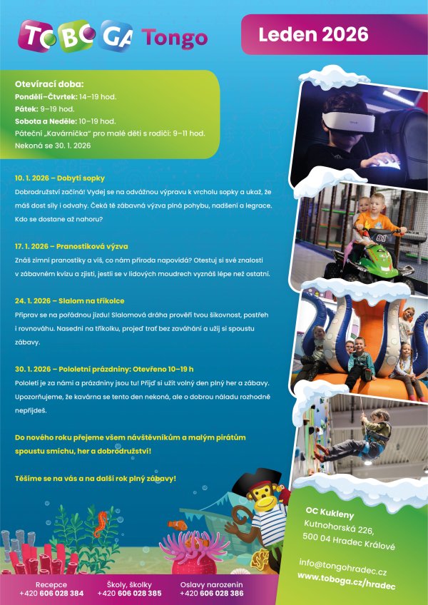 Leden přinese pestrý mix pohybu, soutěžení a zábavných výzev, které potěší malé i velké dobrodruhy. Co nás tento měsíc čeká? To se dozvíte na plakátku.