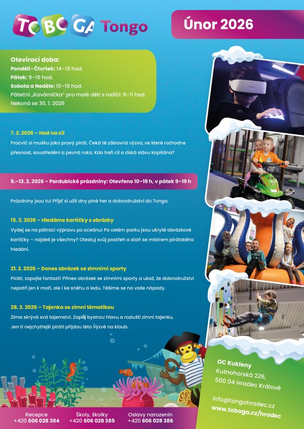 Pardubické prázdniny 9.–13. 2. 2026 si u nás užijete naplno – otevřeno bude celý týden od 10 do 19 hodin, ideální čas na hry, pohyb a spoustu zábavy.
