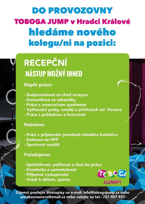 Naskoč na tuto příležitost a staň se členem týmu Toboga JUMP jako RECEPČNÍ!