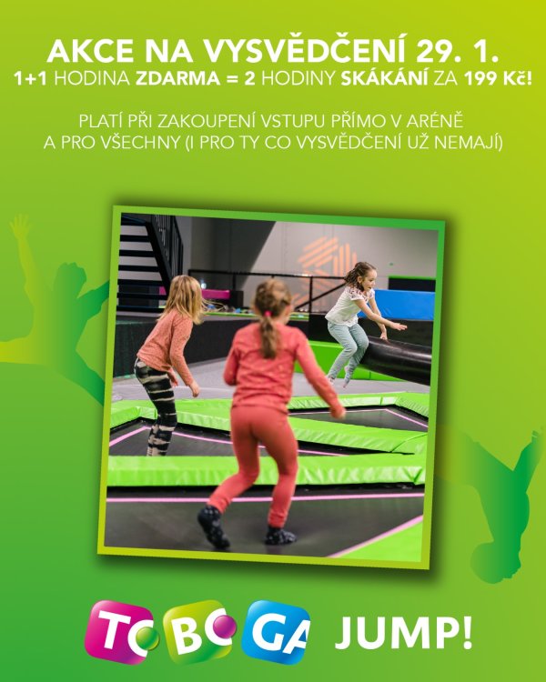 👉 To znamená, že pokud si na vysvědčení koupíte vstup přímo u nás v aréně, máte rovnou 2 hodiny za 199 Kč! Tohle skákání se nebude jen tak opakovat, tak zaskočte za odměnu po vysvědčení do Toboga JUMP! Hradec Králové.😊