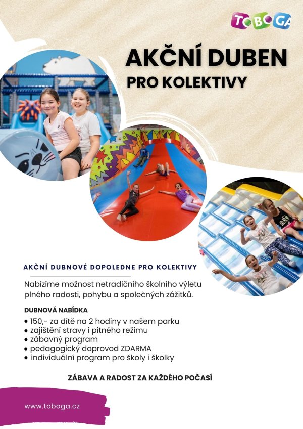 dovolujeme si Vás pozvat do rodinného zábavního parku Toboga Opava a představit Vám speciální dubnovou akci pro školy a školky. Vašim žákům nabízíme možnost netradičního školního výletu plného pohybu, radosti a společných zážitků.