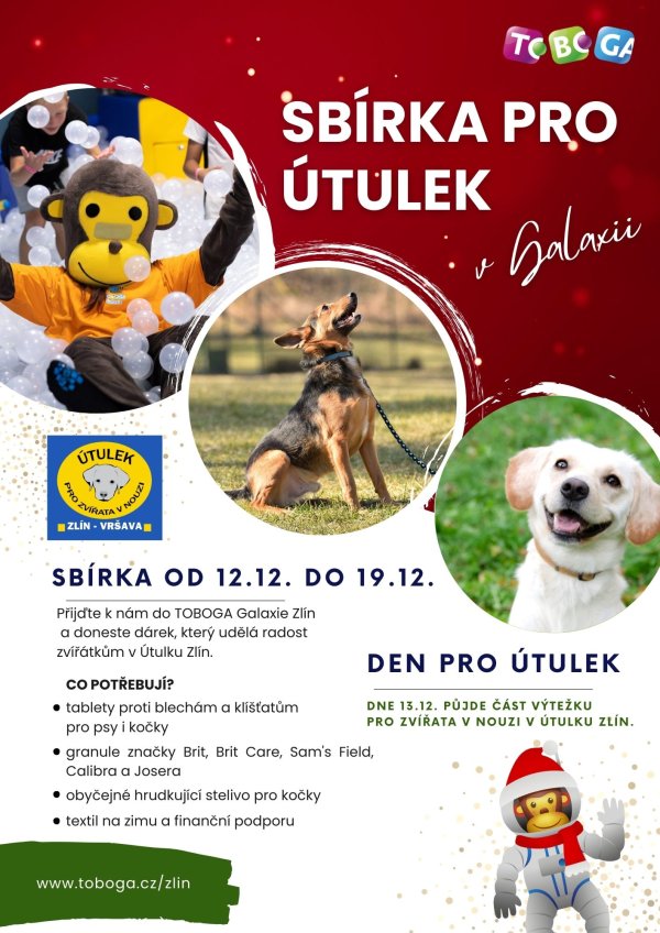 Od 12. do 19. 12. pořádáme v TOBOGA Galaxii Zlín velkou sbírku pro Útulek Zlín. Můžete přinést granule, stelivo, teplé deky nebo antiparazitika 🐶🐱