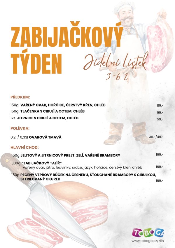 V termínu 3.–6. února pro vás chystáme zabijačkový týden, během kterého si můžete vychutnat zabijačkové speciality připravované podle osvědčených receptů.