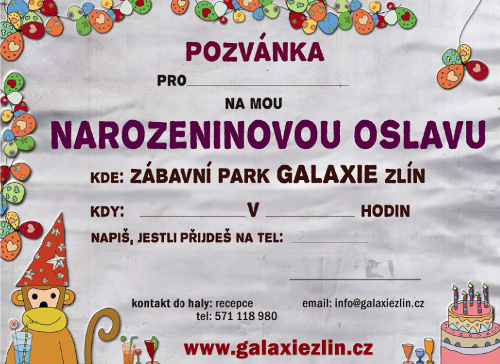 - Změny /datum, čas, počty dětí/ komunikujte na emailu narozeniny@galaxiezlin.cz